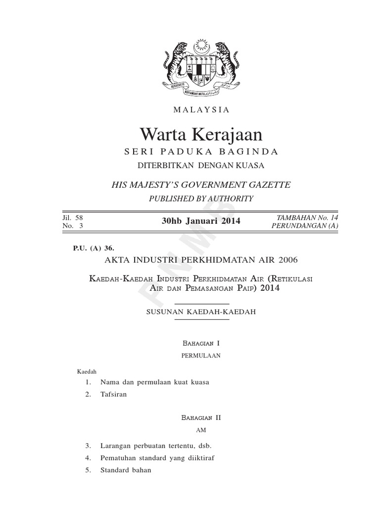 P_U_a 36_2014-Kaedah- Kaedah IPA Retikulasi Air Dan Pemasangan Paip 2014 - Free download as PDF File pdf Text File txt or read online for free. Paip dan pepasangan yang terpaksa melalui ruang duduk kawasan awam tandas dsb. Panduan Pemasangan Am.