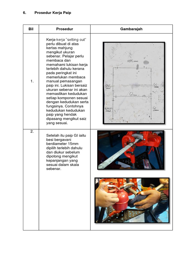 Sistem Tidak Terus Sistem Terus membekalkan air dari meter melalui paip perkhidmatan ke semua pili bilik air dan tandas. 648 Menguji kebocoran pada perangkap botol pili bertiang paip fleksibel dan paip sisa. Antara kerja yang harus dilakukan ialah menggali parit sejauh 400 m untuk memasang paip gas yang digunakan untuk memasak.